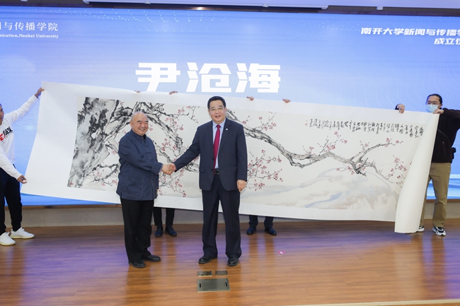 南开大学艺术与美学研究院副院长尹沧海教授(左)向南开大学新闻与传播学院赠送画作,刘亚东院长(右)接受赠画