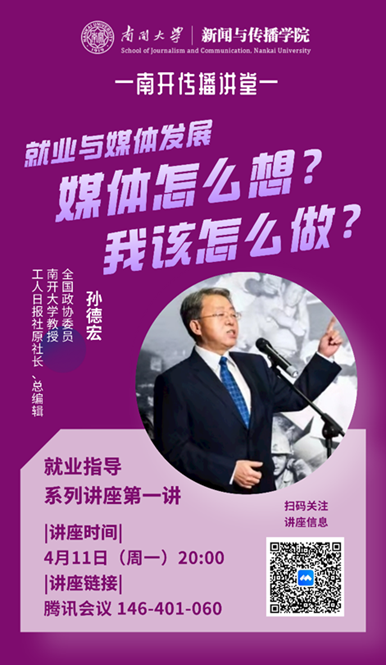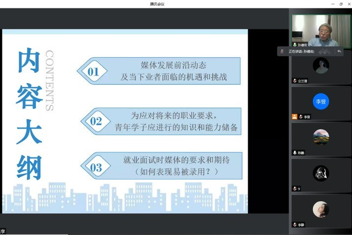 4月11日晚8时,新闻与传播学院“南开传播讲堂”就业指导系列讲座首场开讲。全国政协委员、工人日报社原社长、总编辑孙德宏教授进行了以“就业与媒体发展:媒体怎么想?我该怎么做?”为主题的线上讲座并与学生互动。活动持续了近2小时,由陈鹏副院长主持,在线聆听的人员除新闻与传播学院师生外,还有南开大学其他专业的学生以及媒体从业者。