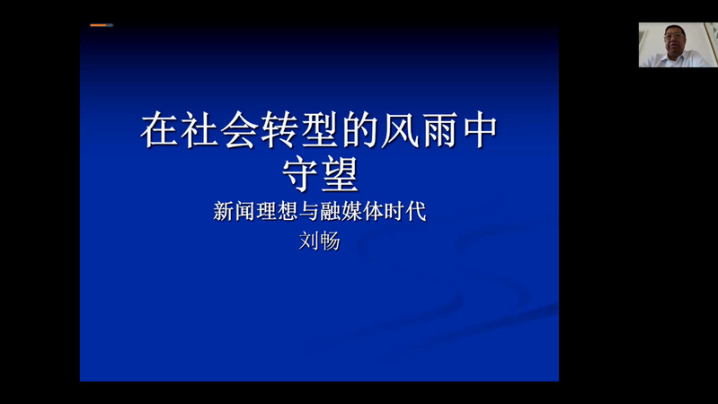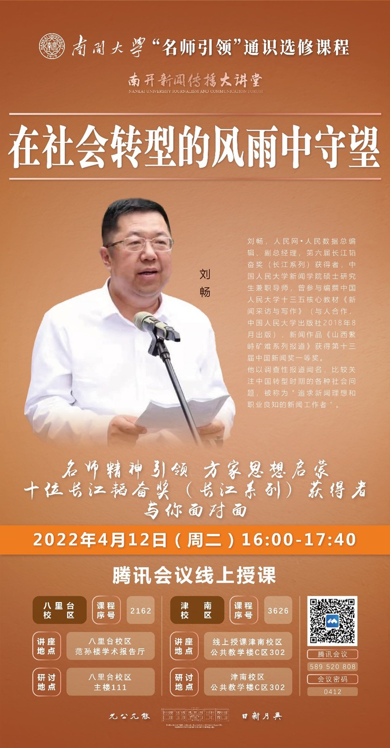 412日下午,人民网·人民数据总编辑、副总经理,第六届长江韬奋奖获得者刘畅走上南开大学“名师引领”通识课“弘扬长江精神 守护新闻理想”的讲台,以视频会议形式为南开师生带来“在社会转型的风雨中守望”的专题讲座。刘畅总编辑围绕信息时代媒体转型、新闻舆论监督、记者使命精神等,结合新闻采写与报道的亲身经历生动诠释了“铁肩担道义,妙手著文章”的长江精神。新闻与传播学院副院长陈鹏主持讲座,并为刘畅总编辑颁发“南开大学通识教育课程特聘教师”证书和“南开新闻传播大讲堂”证书。
