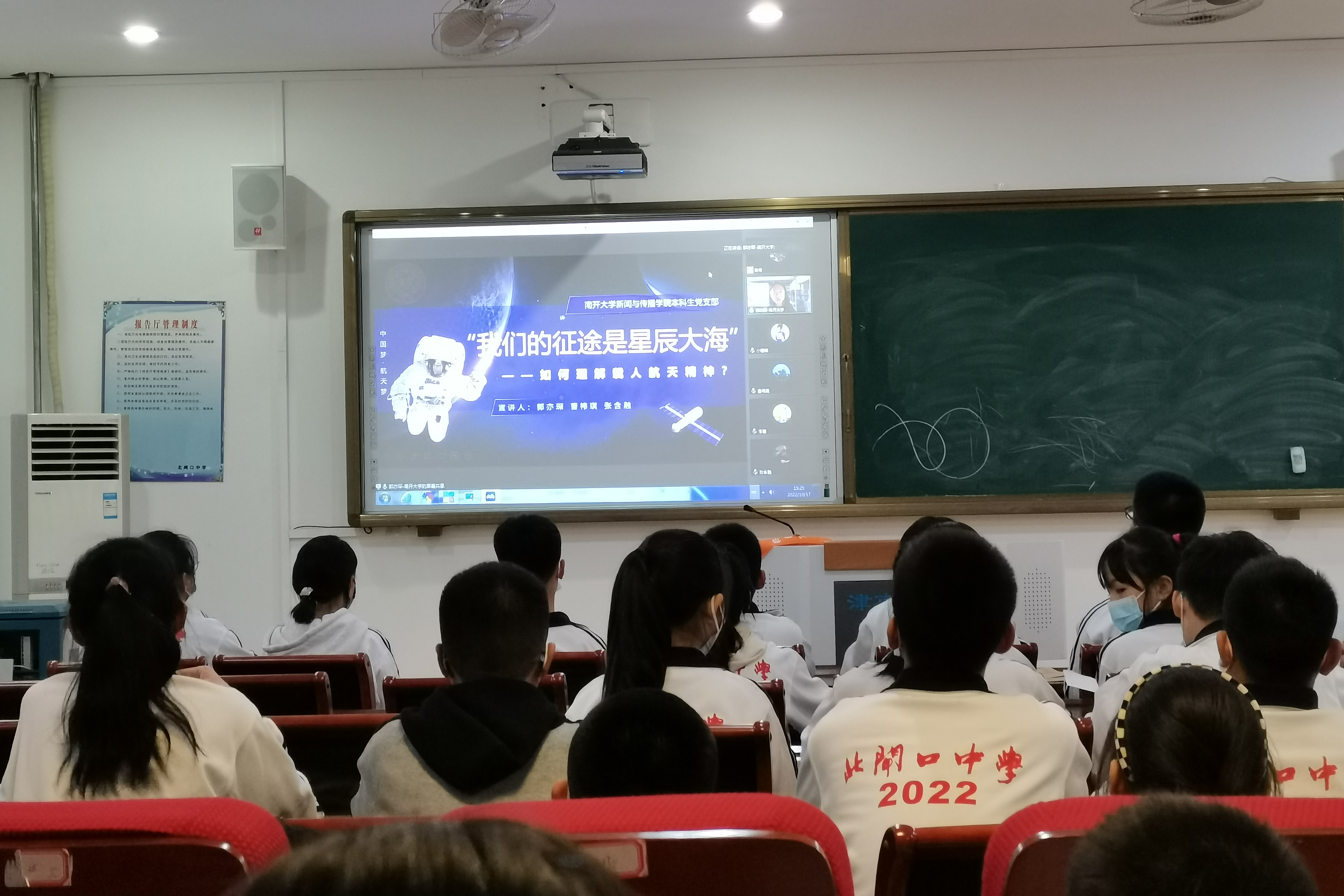 学生党员郭亦琛、曹祎琪和入党积极分子张含融作为宣讲代表,以“我们的征途是星辰大海”为主题,从忆往昔、释内涵、向未来三个维度展开,对载人航天精神进行了充分讲解和阐释。宣讲人从1992年载人航天工程实施切入,解释了载人航天“三步走”的战略部署,介绍了30年来载人航天的发展历程及成就;通过分享“蒙尘的按钮”、“26秒的勇气”等感人肺腑、惊心动魄的经典事例,全方位地展示了特别能吃苦、特别能战斗、特别能攻关、特别能奉献的载人航天精神内核。最后,宣讲人结合赴文昌火箭发射中心拍摄问天实验舱发射的暑期社会实践经历,分享了南开学子继承、发扬载人航天精神的切实行动,勉励全体学生弘扬光荣传统、赓续红色血脉,努力成长为担当民族复兴大任的时代新人。