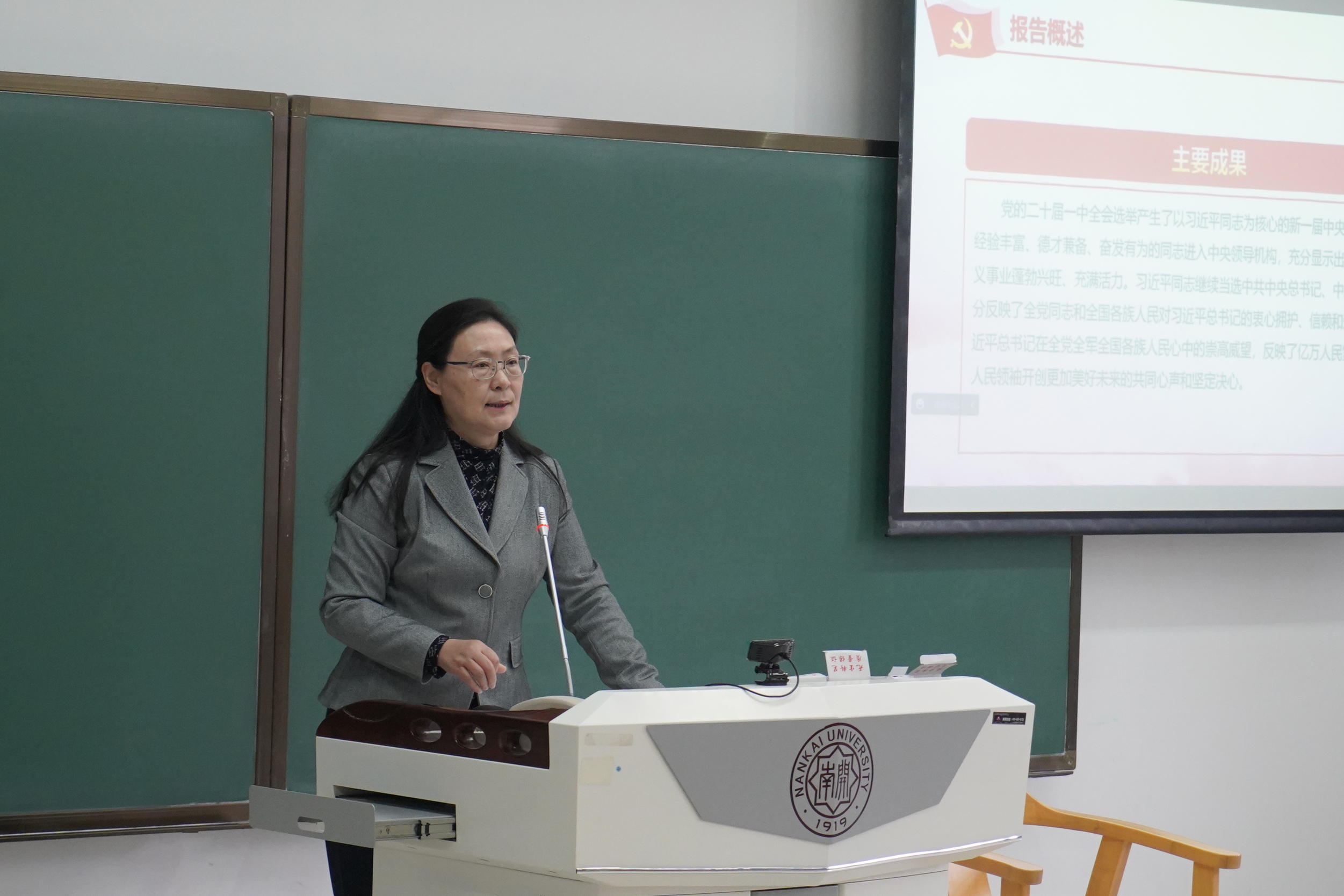 11月10日,南开大学党委副书记、纪委书记赵美蓉以“深入学习贯彻党的二十大精神,与党同心同德、与时代同向同行”为题,为新闻与传播学院全体本科生讲授“形势与政策”课。
