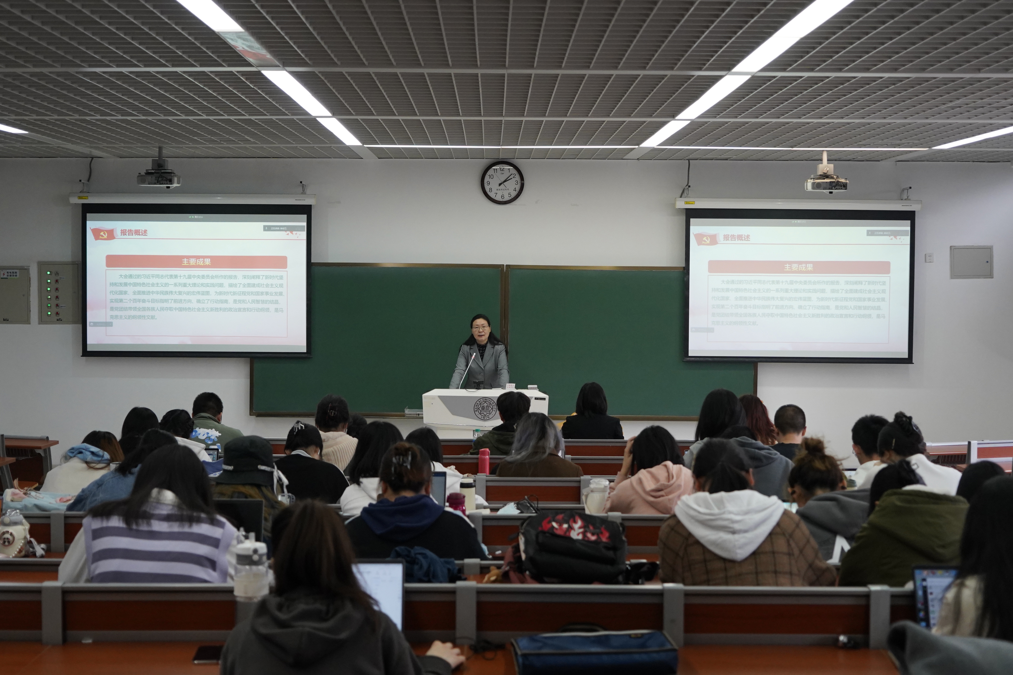 赵美蓉向同学们简要介绍了党的二十大议程、大会取得的主要成果,并通过27个关键词详细解读了习近平总书记所作的大会报告,带领同学们一起深入学习党的二十大精神。