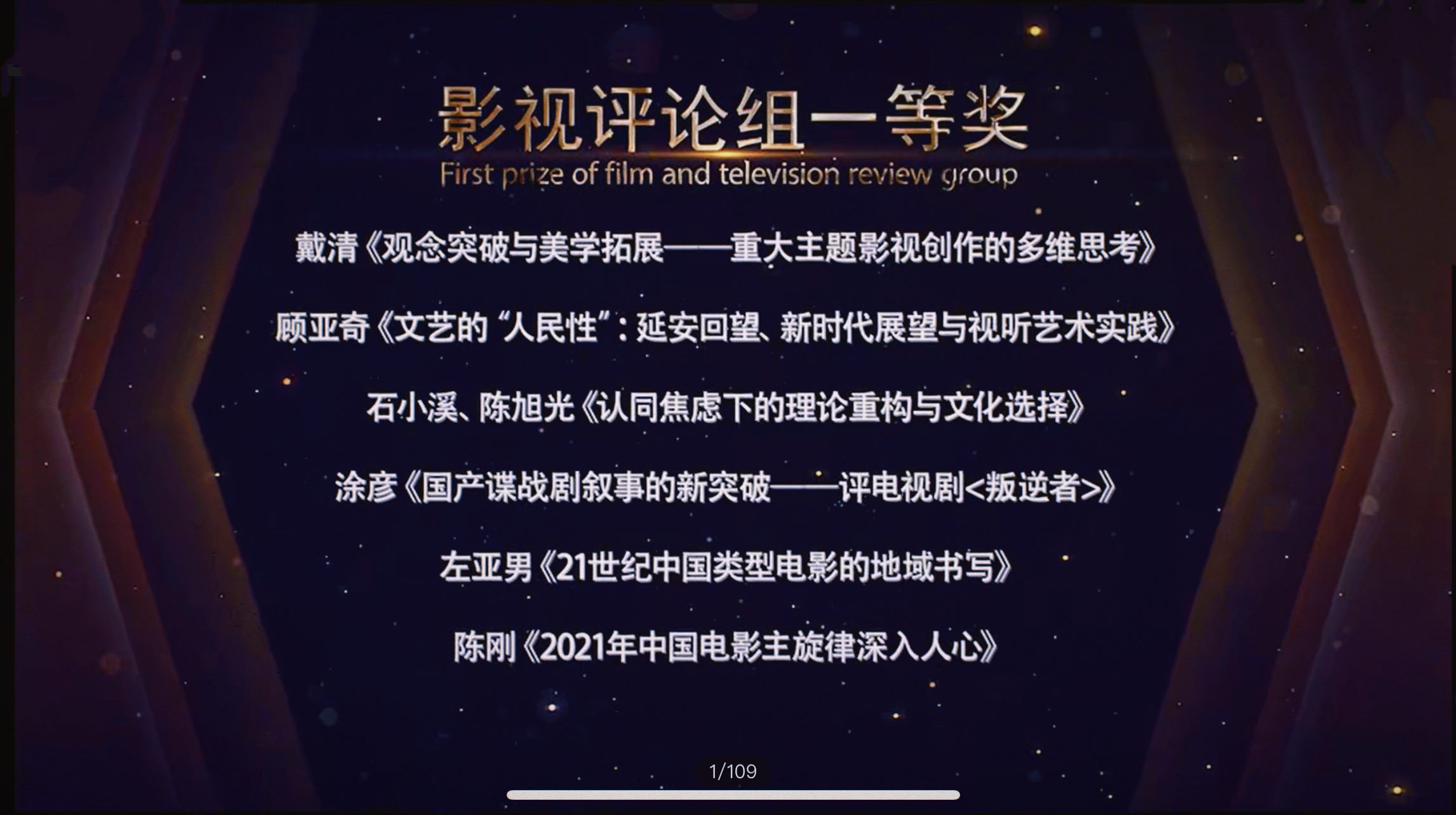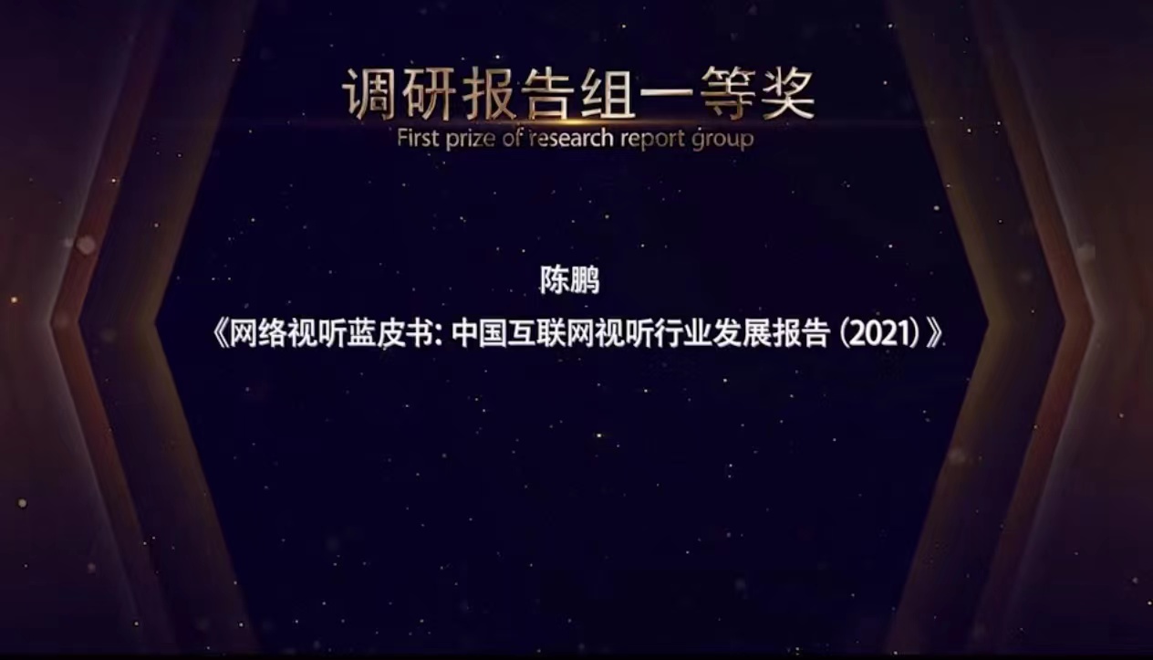 副院长陈鹏主编的《网络视听蓝皮书:中国互联网视听行业发展报告(2021)》获调研报告组一等奖,教师石小溪与北京大学艺术学院教授陈旭光合作的《认同焦虑下的理论重构与文化选择——重读20世纪90年代的后殖民主义电影批评》获影视评论组一等奖,教师田亦洲的《媒介自反、迷影狂欢与影游联动——试论电影<扬名立万>的“互文性”景观》获影视评论组二等奖。