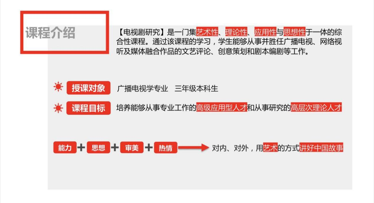 《电视剧研究》课程通过“历史”“理论”“技艺”三位一体的知识体系打造、多维度游戏化教学的实施、以及对实践育人和“线下创作、线上分享”的教学模式的坚持,不仅有效解决了课程长期存在的知识体系松散、理论艰涩、授课形式单一和实践练习不足的问题,还让同学在极具在场感的教学环境和明确的教学目标中产生出对理论的学习兴趣,积极发挥出主动分享自己创作作品的主观能动性。“结课聊天室”创新交流形式的引入,改变了僵化的师生评教模式,延展了教学内容,扩大了该课程的社会影响力。课程的多项创新改革举措在对南开大学的新文科建设助力的同时,充分发挥出具有标杆价值的示范引领作用。