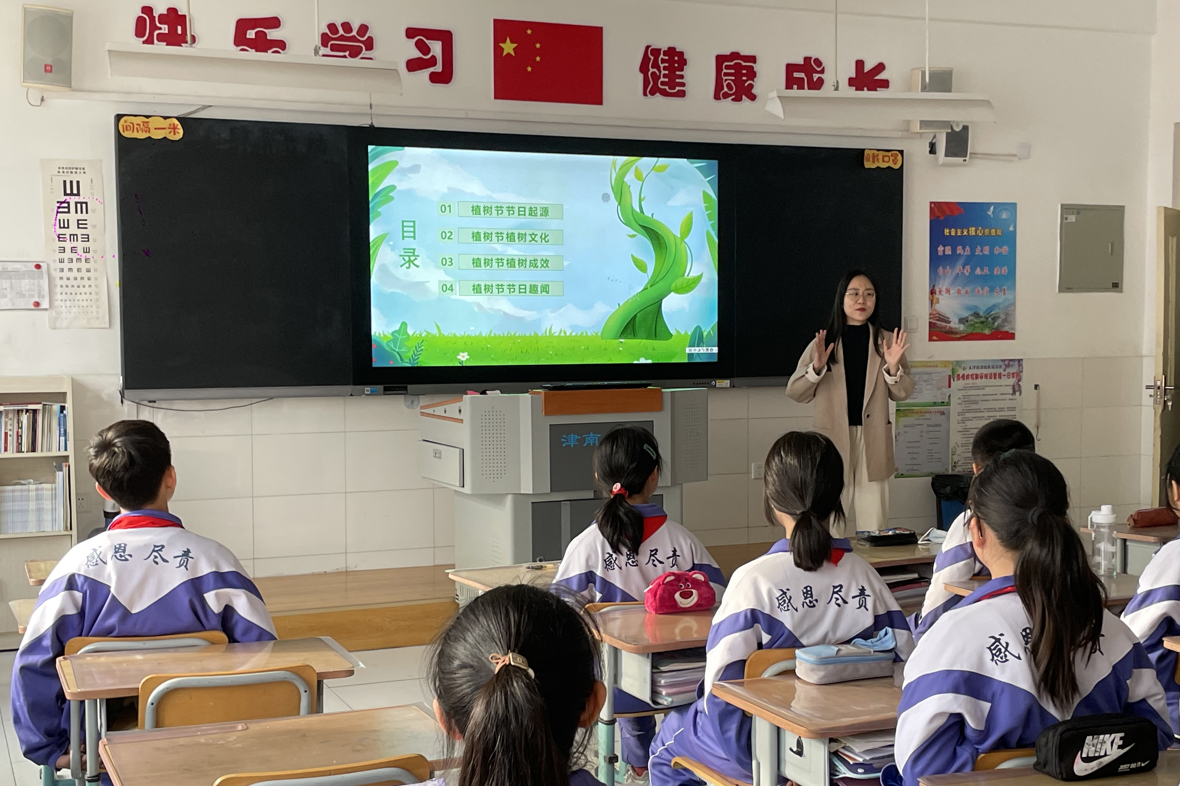 志愿者们以植树节为切入点,通过故事宣讲、纪录片放映、课堂互动等多种形式,向葛沽镇第二小学六年级学生介绍了新时代我国生态文明建设的举措和成效,以“绿水青山就是金山银山”的生动实践向学生们展示人与自然和谐共生的重要性。