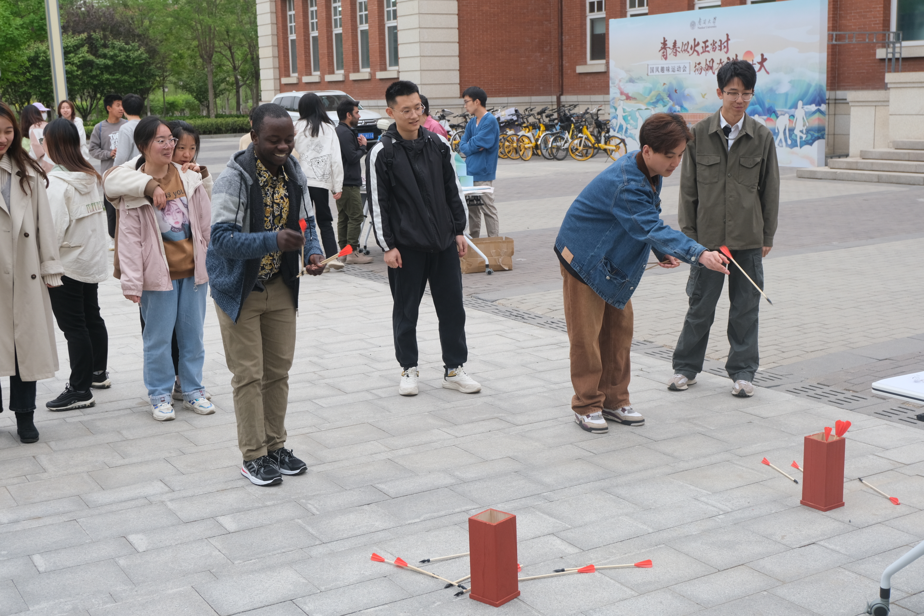 本次运动会设置了蹴鞠、空竹、毽子、陀螺、投壶和木射等六个传统体育项目,集锻炼性、趣味性、协作性于一体。比赛中,大家勇于尝试,互相鼓励,默契配合。现场还有许多外国留学生参与,积极挑战各个项目,体验中国传统文化。在场的中外学生们都沉浸在现场热烈欢乐的气氛中,广场上洋溢着他们的欢声笑语,场面趣味无穷。