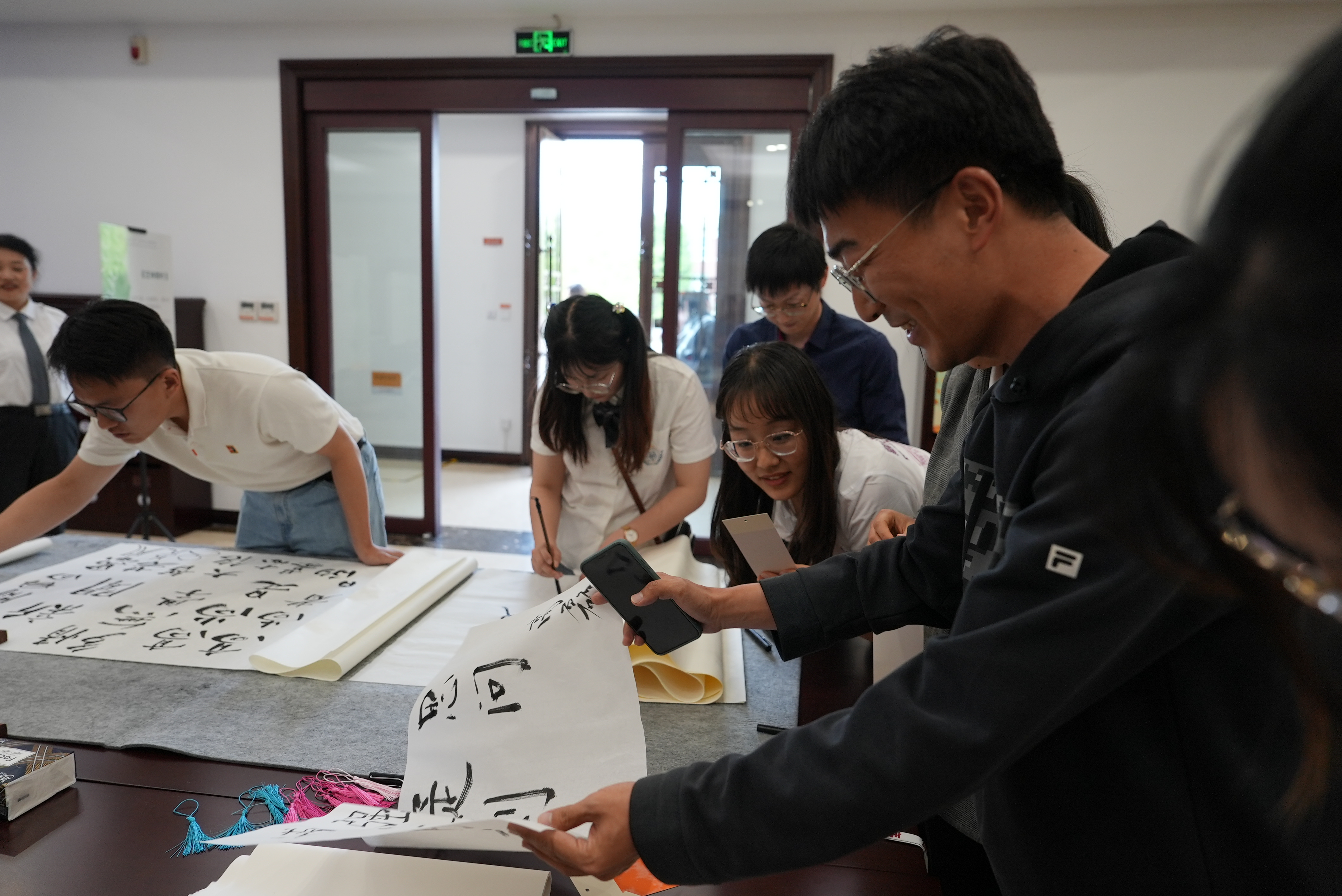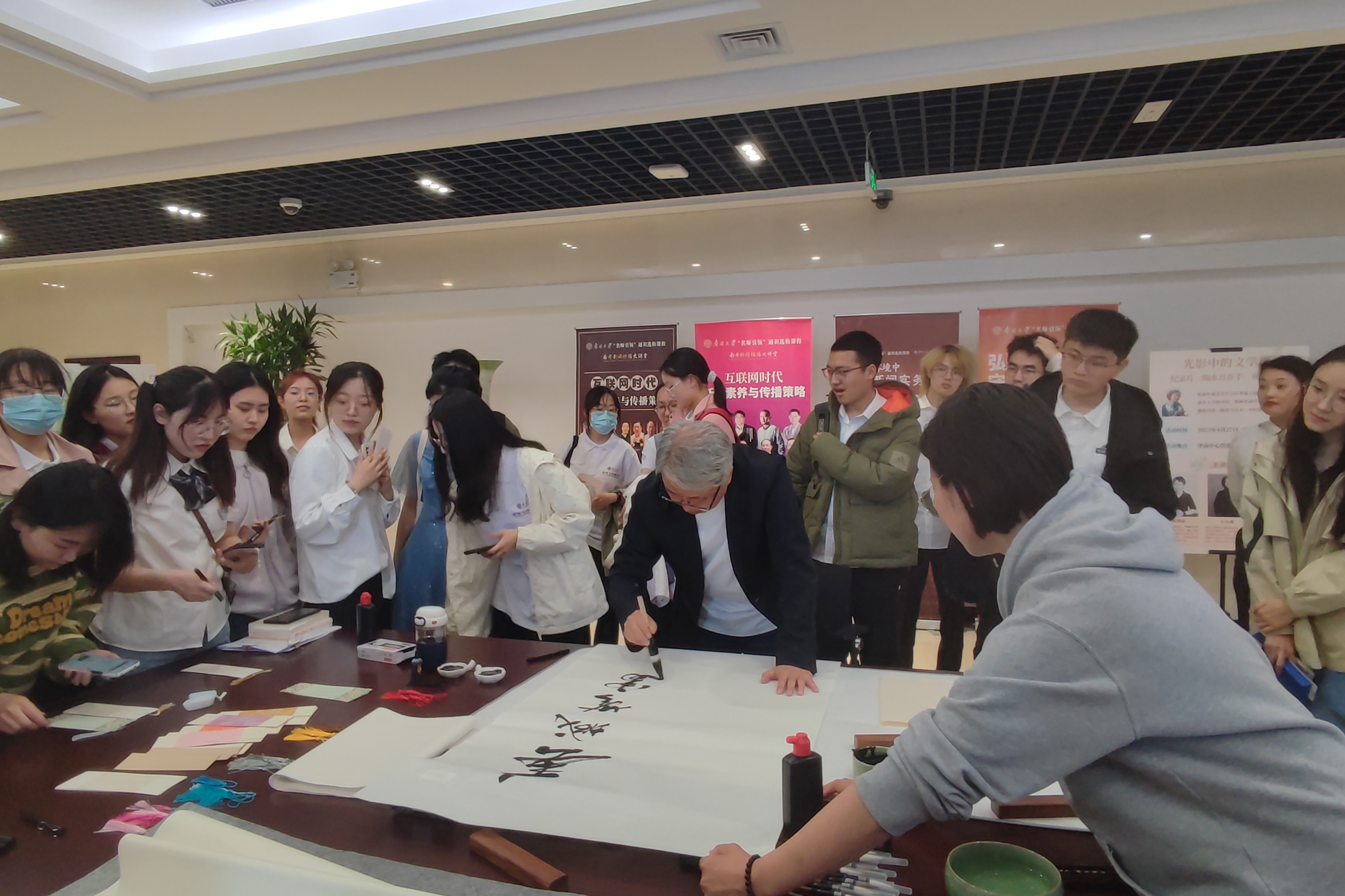 “师生笔会”活动邀请了孙德宏教授围绕“读书”主题题字。活动现场准备了毛笔、宣纸、墨汁、书签等工具,方便大家在书写中感受汉字的魅力。在孙教授的示范下,部分师生也加入创作的队伍,在宣纸或书签上书写青春色彩,表达良好祝愿,在实践中了解意蕴丰富的中国优秀传统文化。