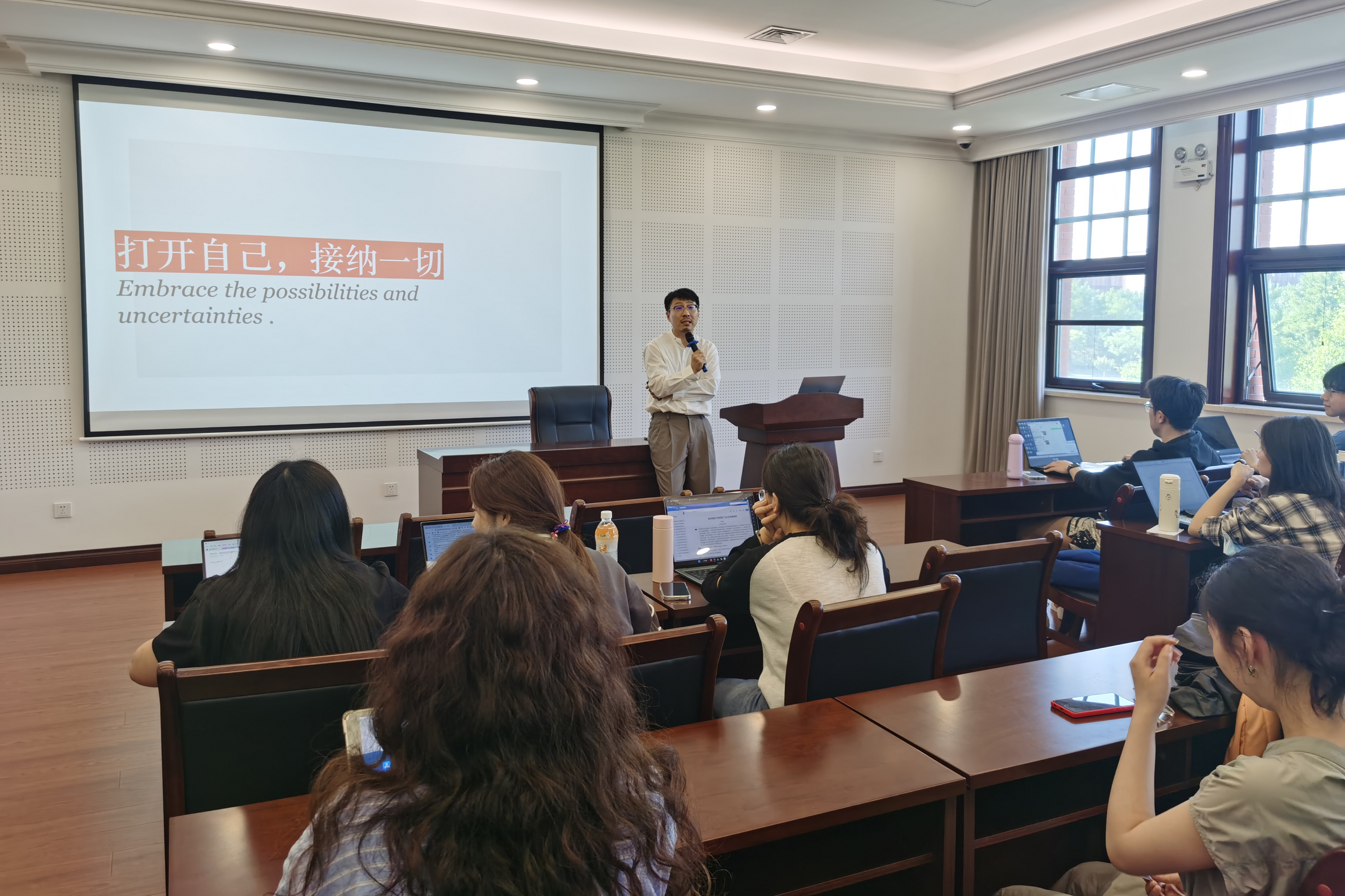 拥抱可能性、敢于面对不确定性,是田亦洲老师讲座的开篇之语。大学时光里第一次演戏、参与北京大学生电影节的相关工作、第一次接触混剪视频……田亦洲老师的讲座在一个又一个故事中展开,深深吸引了在场的同学们。本科到博士后期间,田亦洲老师先后运用电影理论分析了电影文本,探索电影理论,研究跨文化视域下的电影理论史,最后走向电影理论翻译史。他鼓励同学们说:很多年之后大家当年回想现在,会明白到每一分努力都不会白付出,意识到自己适合什么是非常重要的,我们人生要在混沌当中创造意义。