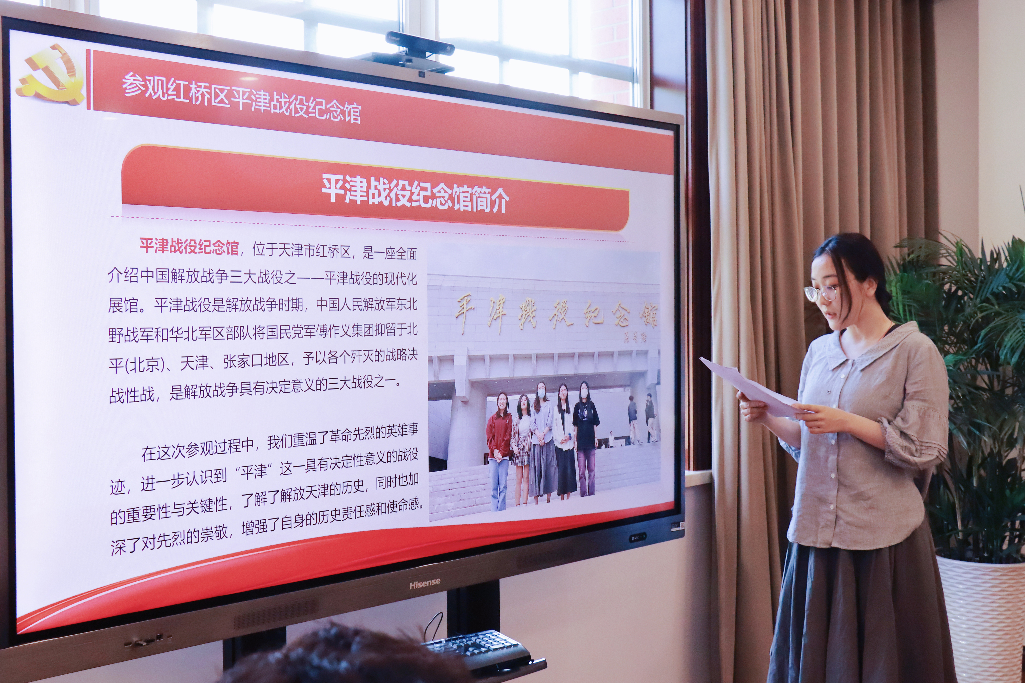 由2021级硕士研究生王隽、袁满,2022级硕士研究生刘晨、石琛、韩子怡五位同学组成的第一小组做了题为“赓续红色血脉,传承红色基因”的汇报,围绕参观平津战役纪念馆的调研经历,结合大学生网络党校培训平台的理论学习,分享了对习近平强军思想的深刻理解和认识,表达了增强自身历史责任感和使命感的决心。
