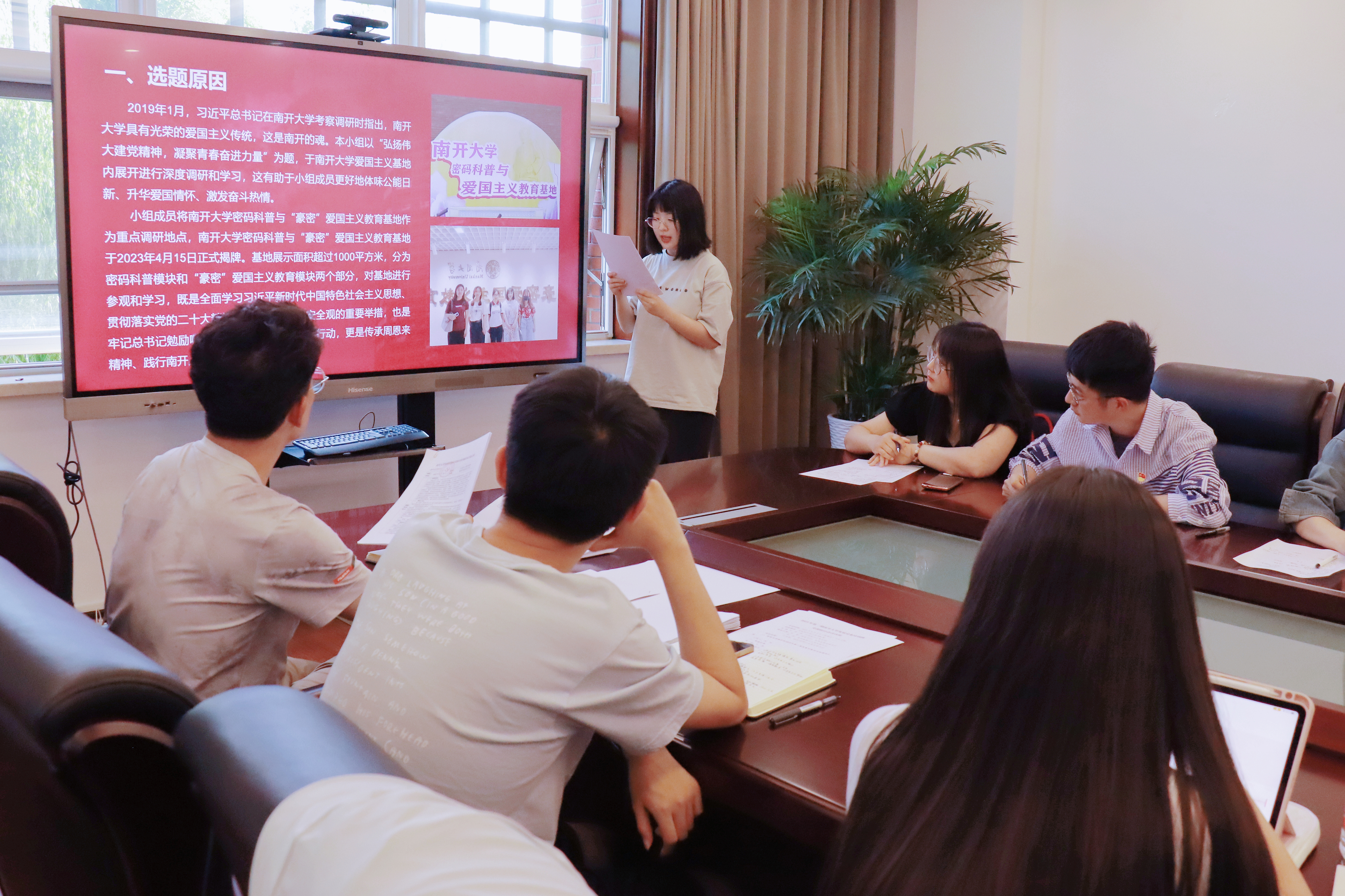 由2021级本科生蔡乐怡,2020级本科生冯乐文、陈佳媛、李紫琦、范可欣五位同学组成的第三小组做了题为“弘扬伟大建党精神,凝聚青春奋进力量”的汇报,围绕参观南开大学密码科普与‘豪密’爱国主义教育基地的调研经历,分享了周恩来及南开与中国密码事业之间的故事,表示要增强国家安全意识,践行总体国家安全观,以忠诚之心和勇毅之举维护国家安全,不负时代重托。