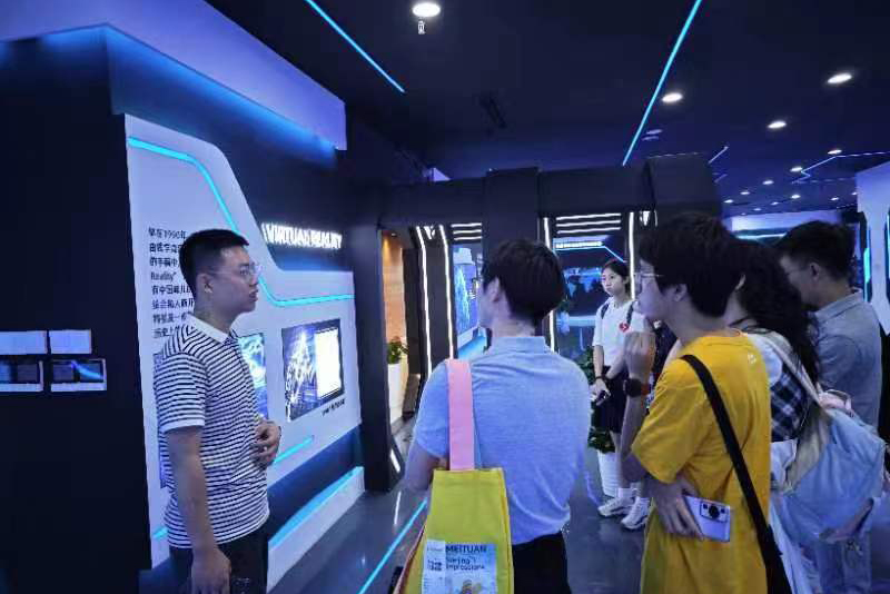 实践团队在江宁元宇宙中心相关负责人的带领下,参观调研了灵境元宇宙研究院,团队成员近距离接触了解仿生机器人、AR头显、数字虚拟人、VR游戏等元宇宙科技产品及其在社会传播中应用。