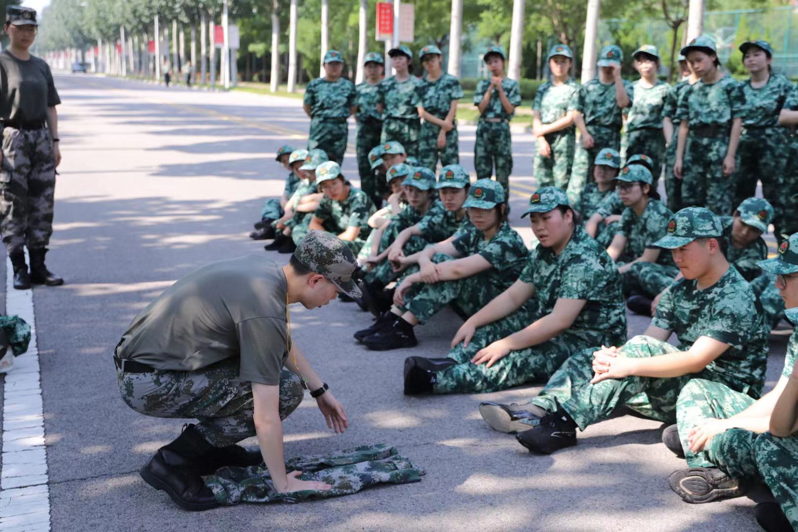 在训练休息时间,同学们围坐在教官周围学习内务整理。教官为同学们演示了整理衣物的过程并进行了详细的讲解。一件外套就在简单的“叠、压、捋”几个动作之下,变成了四四方方的“豆腐块”。经过观摩学习,大家跃跃欲试,都拿起自己的外套来实践。