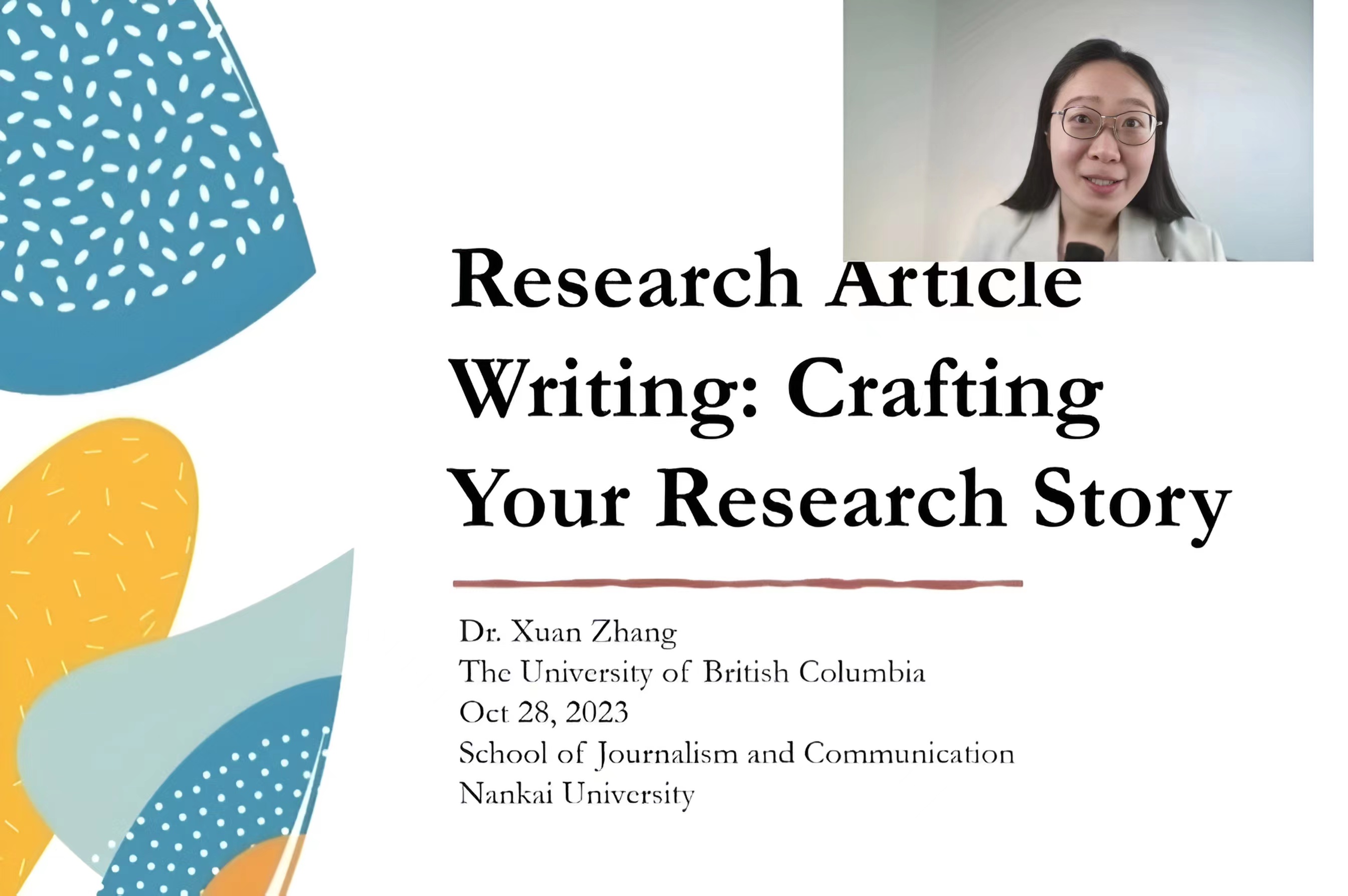 10月28日上午,新闻与传播学院党员先锋岗学业学术辅导站举办了“英语学术论文写作:构建属于你的科研故事”主题讲座。本次讲座邀请加拿大英属哥伦比亚大学(UBC)学术写作中心张旋老师主讲,南开大学新闻与传播学院周才庶老师主持。讲座从英文学术写作基本方法、文章范例和写作小练等三个层面展开。