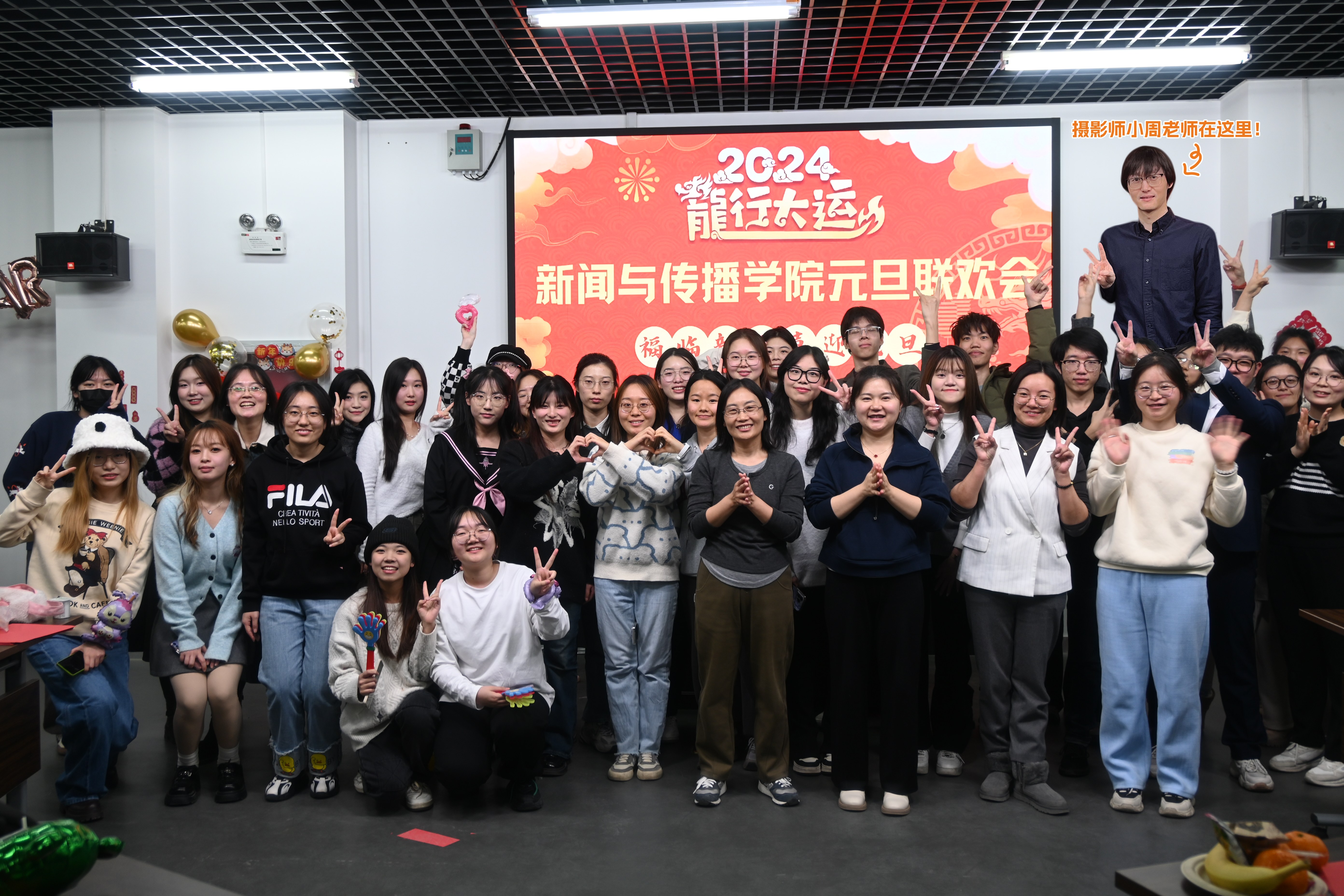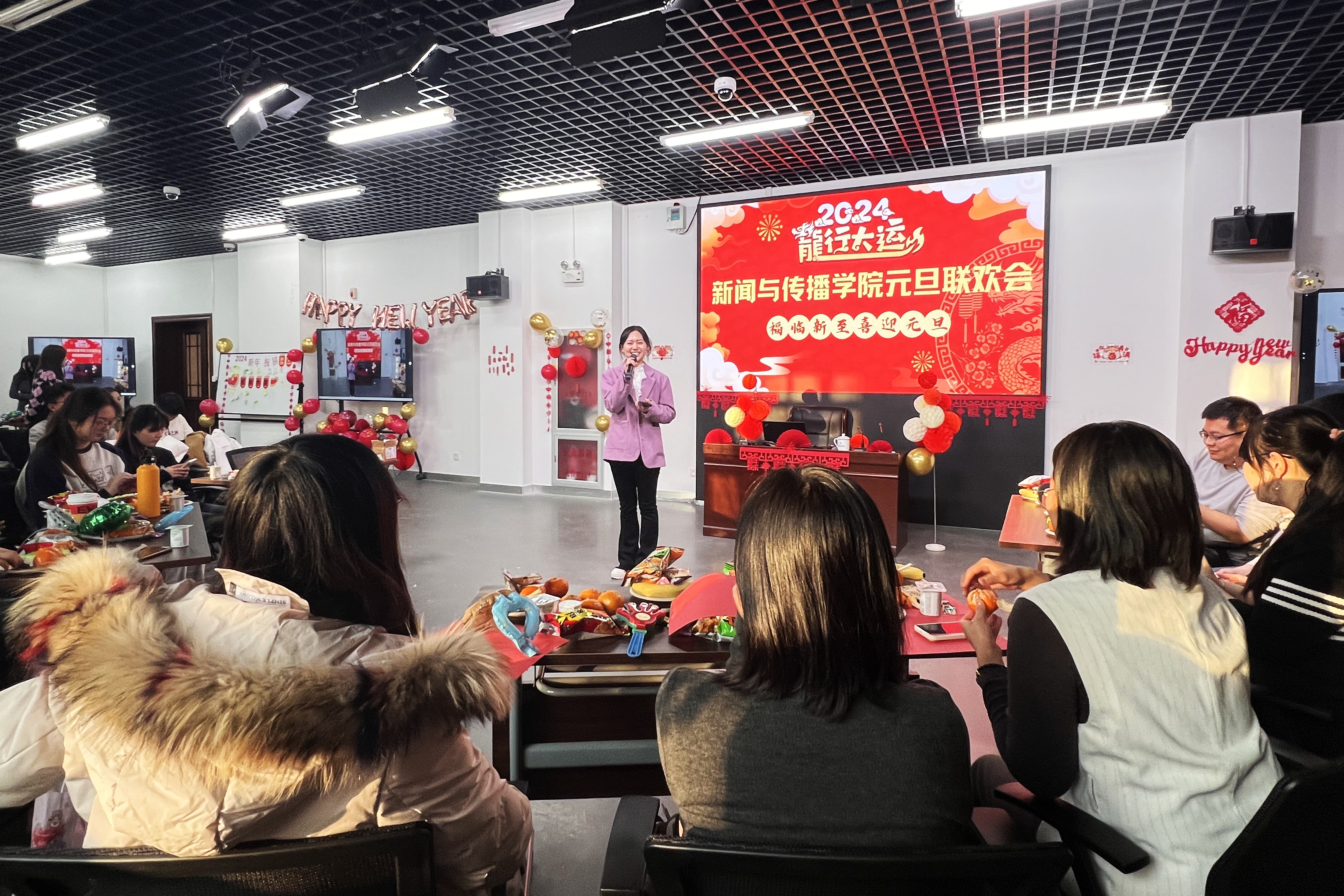 12月28日,新闻与传播学院举办“福临新至,喜迎元旦”新年联欢会暨首届融媒体作品传播大赛颁奖典礼。秀山堂内张灯结彩、热闹喜庆。学院党委书记马长虹、党委副书记兼副院长李慧和多位老师也来到了活动现场,与同学们共赏节目、共迎新年。