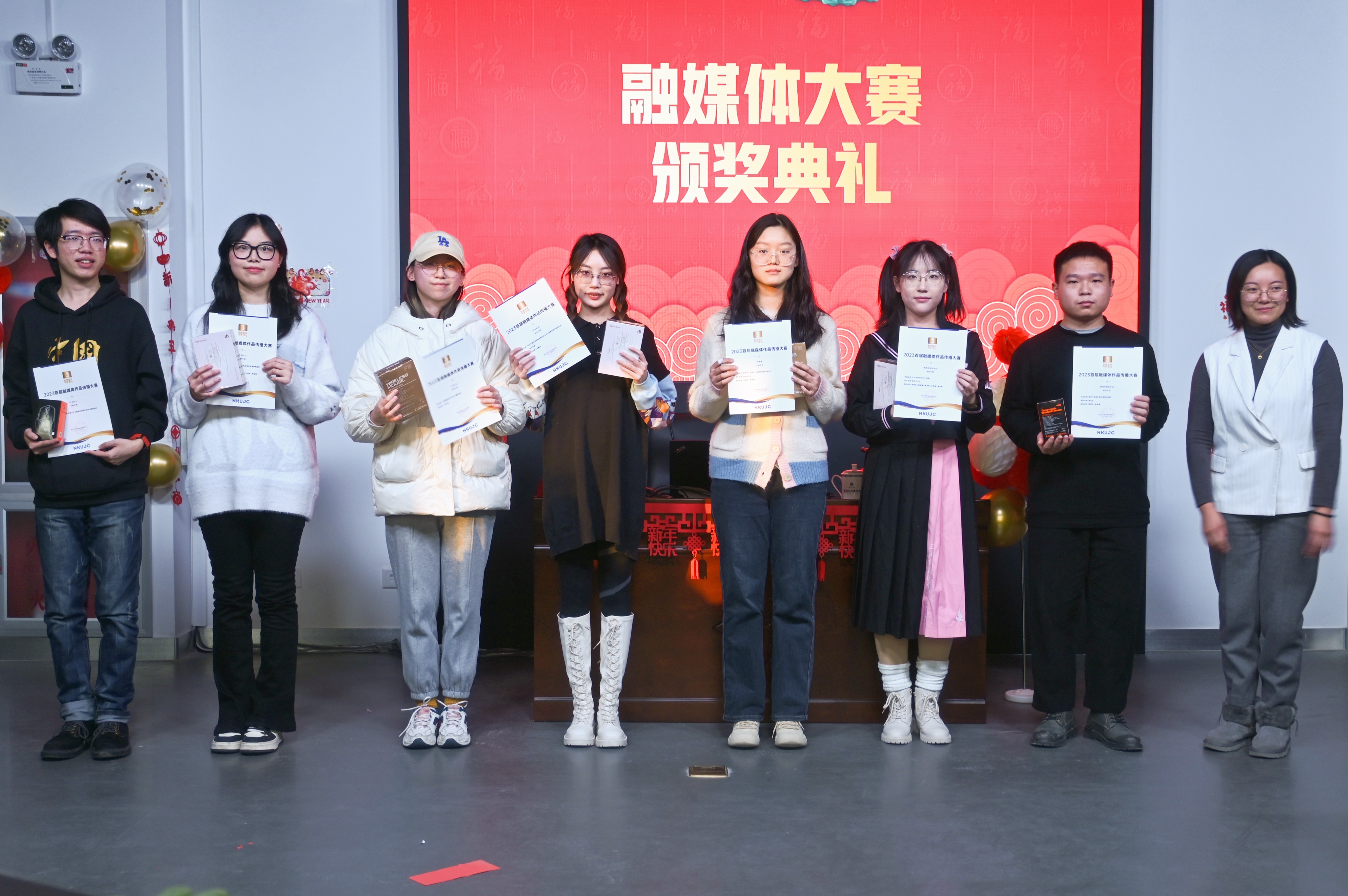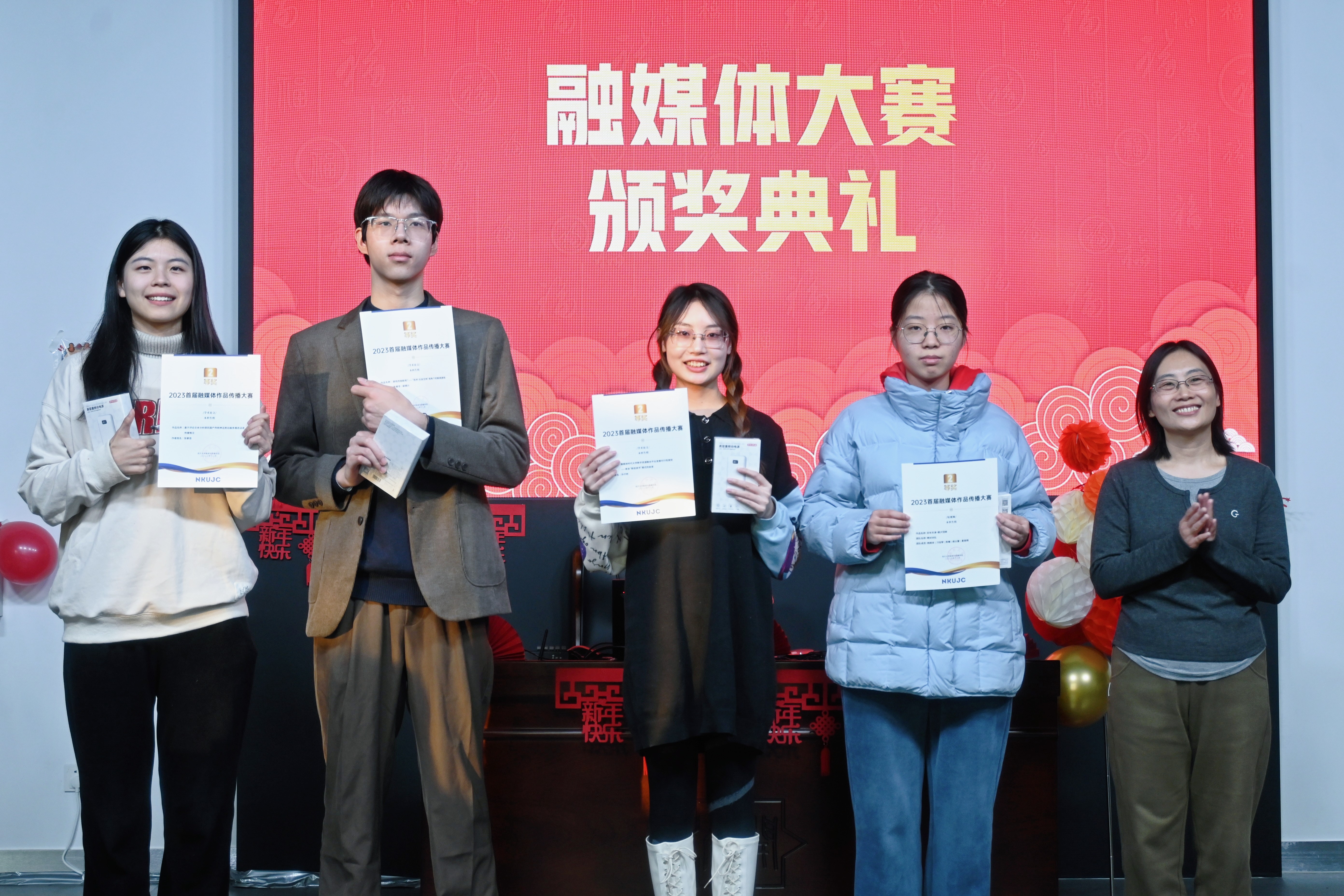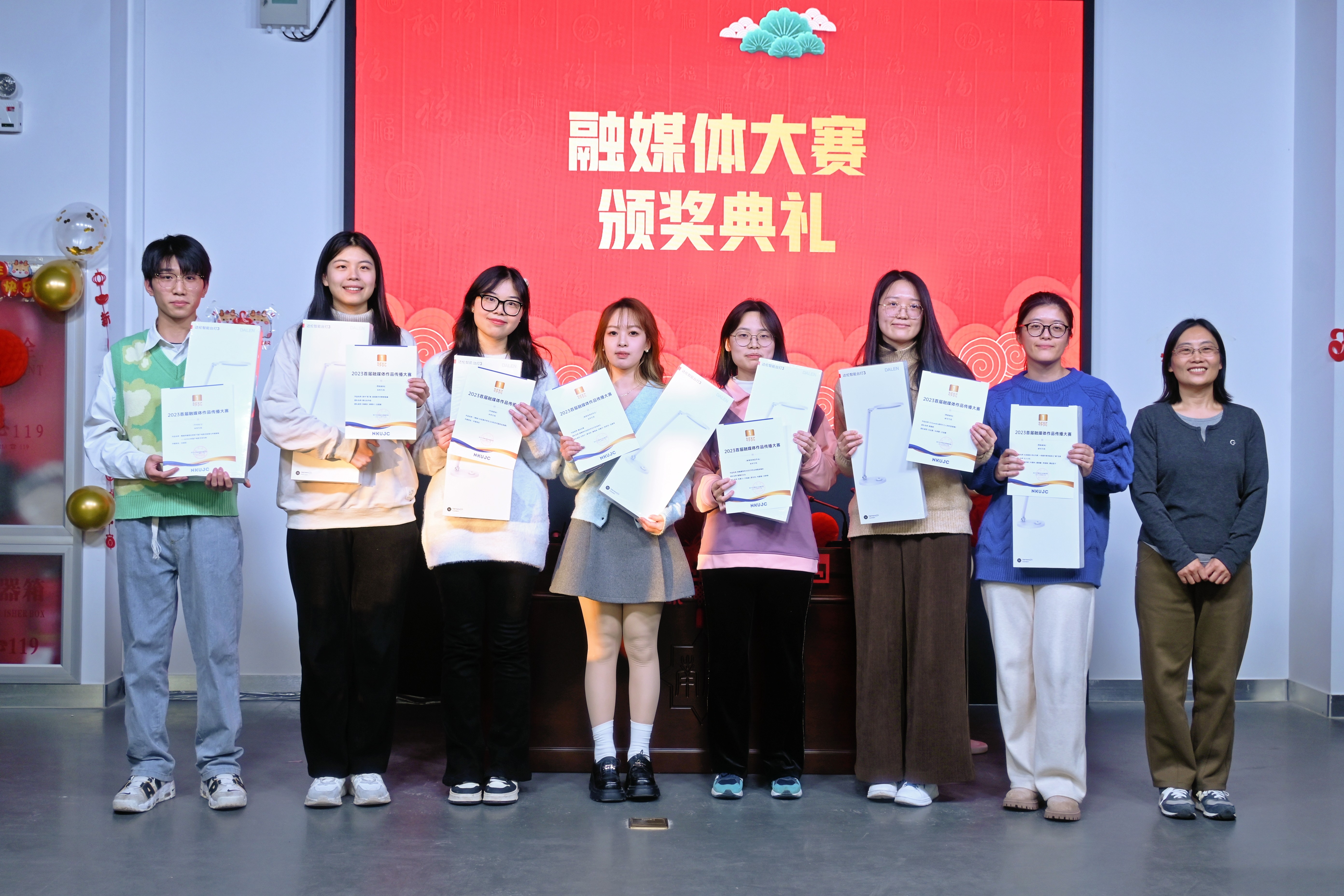 联欢会现场举行了学院首届融媒体大赛颁奖典礼,马长虹、李慧分别为获奖团队颁奖。