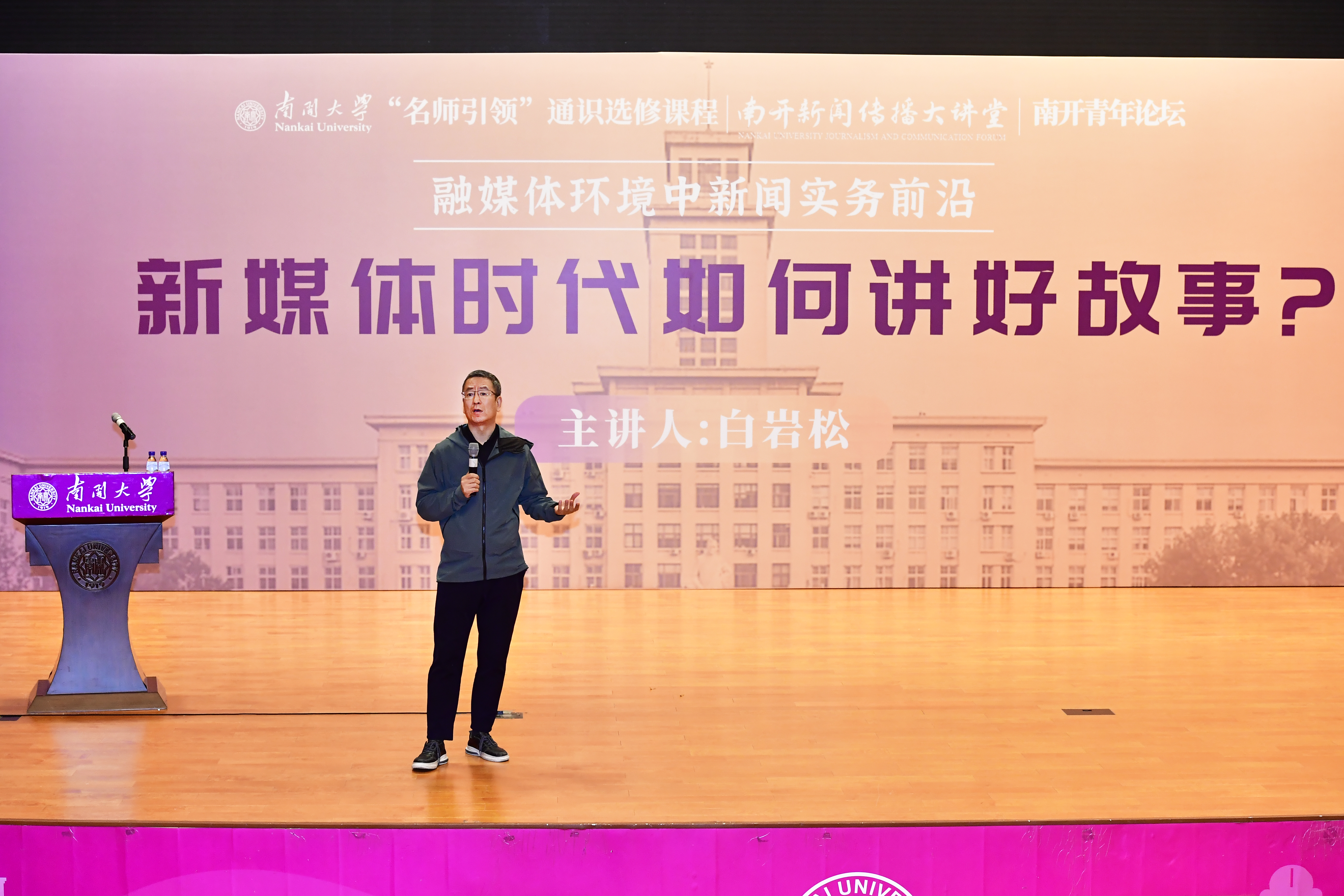 4月23日,南开新闻传播大讲堂在南开大学津南校区大通学生中心举办,中央广播电视总台新闻评论员、主持人白岩松作为新闻与传播学院“名师引领”通识选修课程的主讲嘉宾,与现场近800位观众面对面交流,向同学们分享了作为媒体人如何在新媒体时代讲好故事的经验,为大家上了一堂高质量的新闻实务专业课。