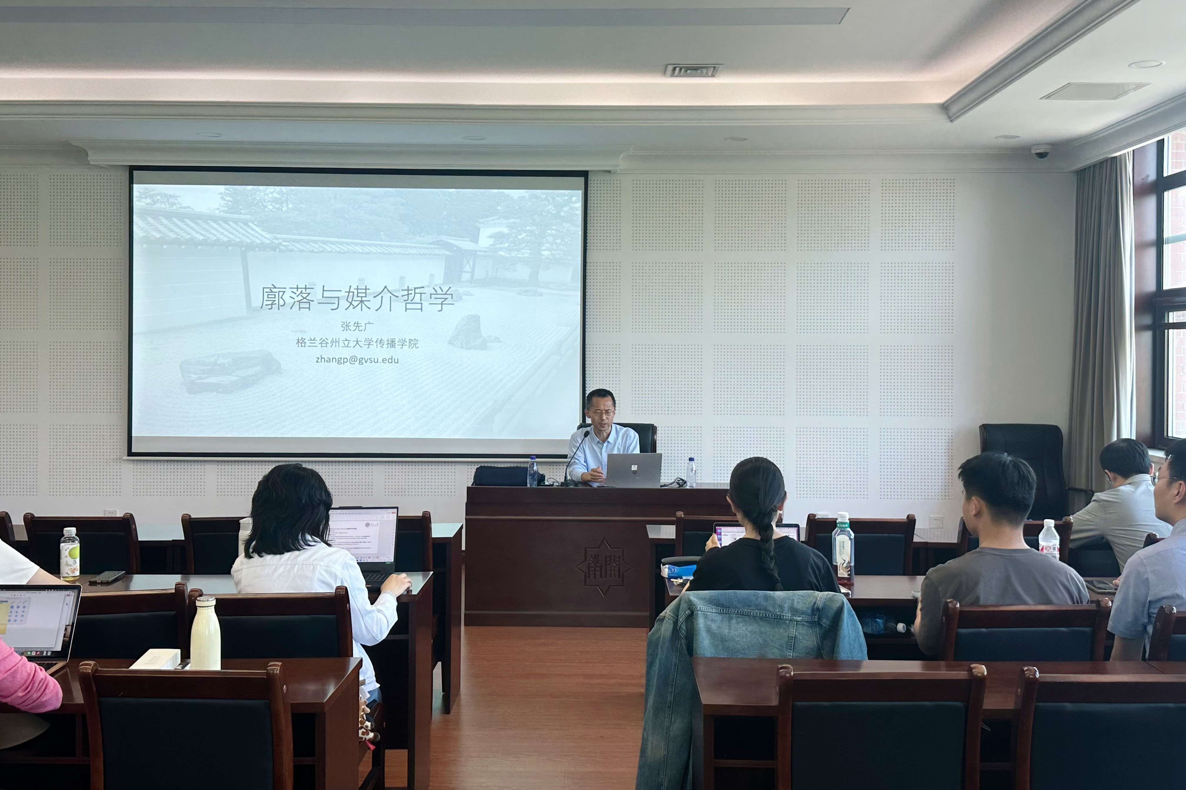 5月7日下午,美国格兰谷州立大学传播学院张先广教授到访南开大学新闻与传播学院,洽谈合作交流,并以“廓落与媒介哲学”为题做客南开传播讲堂,为学院师生进行讲座。学院副院长陈鹏主持活动。