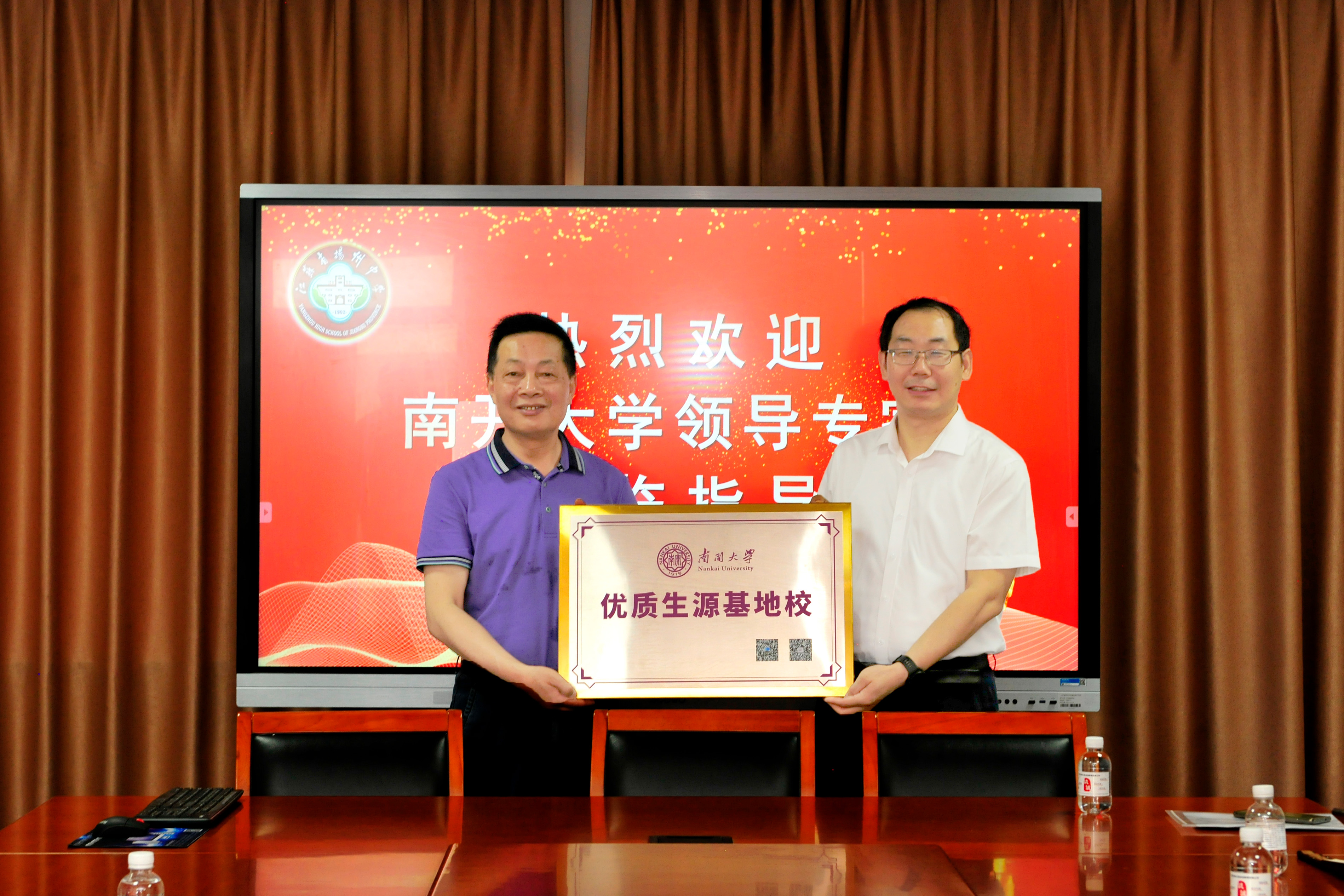 牛文利代表南开大学对扬州中学持续多年为南开大学输送优秀毕业生表示感谢,对扬中学子在南开大学的优秀表现及毕业发展情况进行了介绍,授牌扬州中学“南开大学优质生源基地校”,希望今后能进一步加强实验室合作建设,在共育英才方面走深走实,让越来越多的优秀扬中学子进入南开大学学习深造,成为周恩来总理的校友。南开江苏校友多年来以各种形式回馈母校。