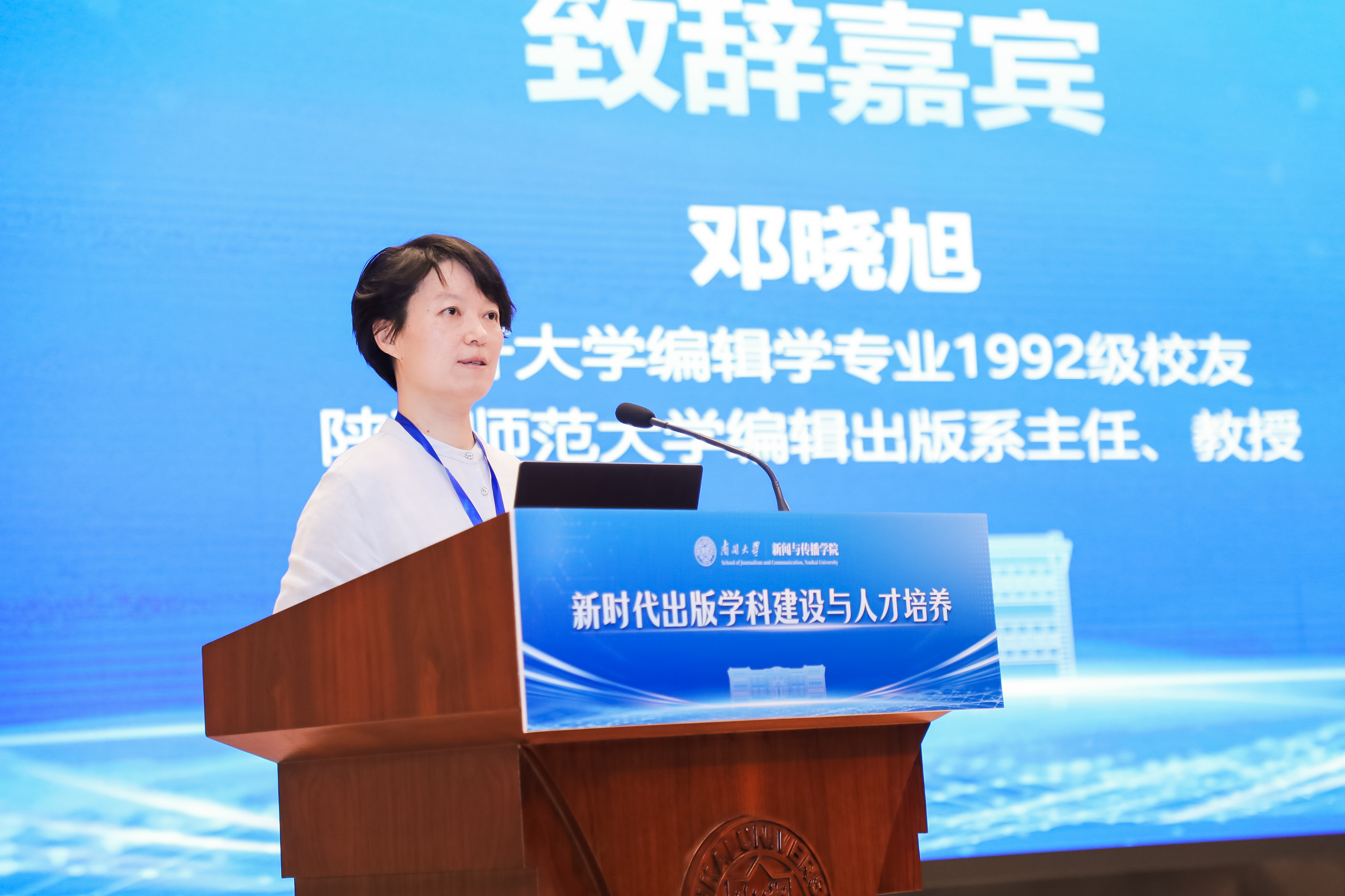 南开大学编辑学专业1992级校友邓晓旭的致辞饱满深情。她说,回到母校重温爱国三问,南开精神中深厚的爱国情怀已融入每一个南开人的血脉。她指出,编辑出版是文化强国的基础,编辑出版专业以培养具有家国情怀、国际视野、深厚学养、知行合一的复合型后备人才为目标。她鼓励在场的学生和未来的编辑出版人以传承文明、启迪智慧为己任,为文化强国的建设贡献力量。
