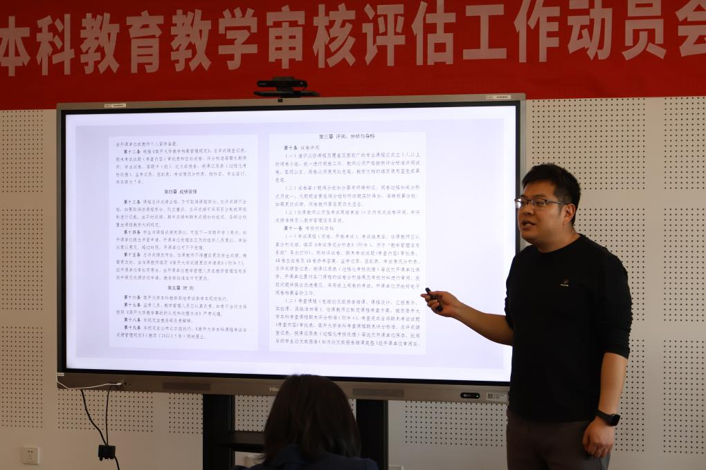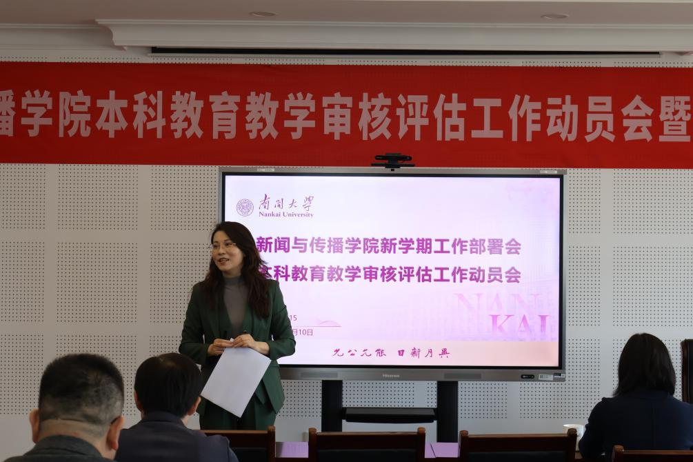 副院长陈娜全方位解读了新一轮本科教育教学审核评估的内涵要义、核心原则、导向要求等内容,并结合“南开卓越公能人才培养体系3.0”的核心理念对学院迎评促建任务清单和工作安排作了详细梳理。她特别强调了新一轮本科教育教学审核评估的重要性,并根据学院现有资源与发展方向,提出以迎接审核评估为契机, “铸魂·融通·致用”三位一体,努力探索新文科视域下马克思主义新闻出版观引领的高素质全媒型人才培养路径。下一步学院将加强马克思主义新闻出版观教育,推动学科交叉,强化实践教学,上下齐心构建起具有南开特色的新闻传播学本科教学体系,打开学院本科教育教学质量提升新局面。