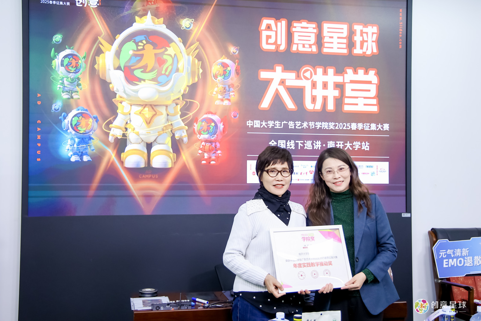 中国大学生广告艺术节学院奖秘书长、广告人文化集团副总裁袁健女士向南开大学新闻与传播学院颁发中国大学生广告艺术节学院奖2025春季征集大赛·年度实践教学推动奖,南开大学新闻与传播学院副院长陈娜教授代表学院接受此荣誉。