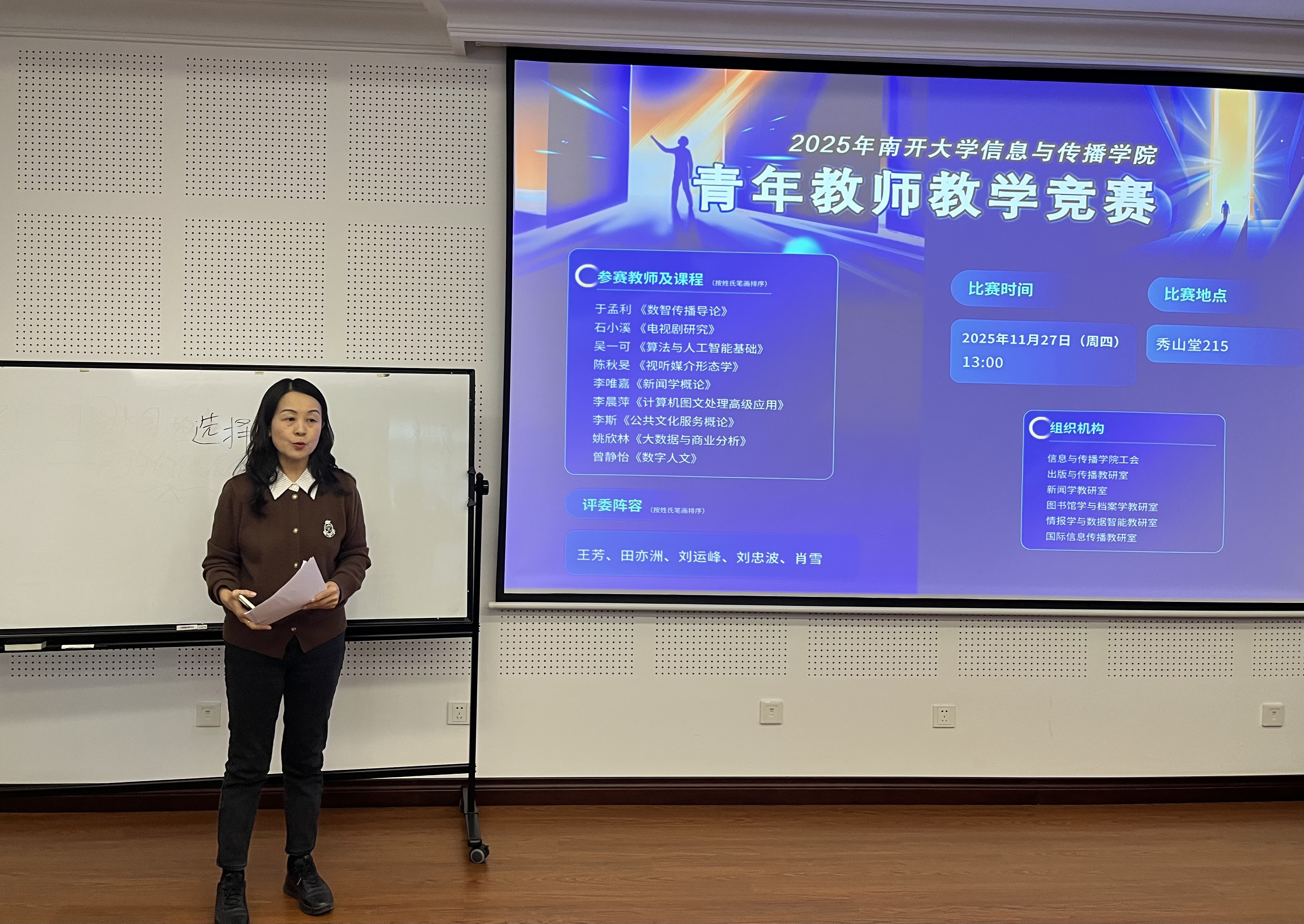 为深入学习贯彻习近平新时代中国特色社会主义思想和党的二十大精神,落实全国教育大会及新时代教师队伍建设改革部署,弘扬劳模精神、劳动精神、工匠精神与教育家精神,南开大学信息与传播学院积极响应天津高校第十八届青年教师教学竞赛预赛号召,于1127日举办了青年教师教学竞赛。校工会焦艳婷副主席、张雪老师莅临指导,学院陈娜副院长、王辰副院长陪同观赛,共同见证青年教师成长。
