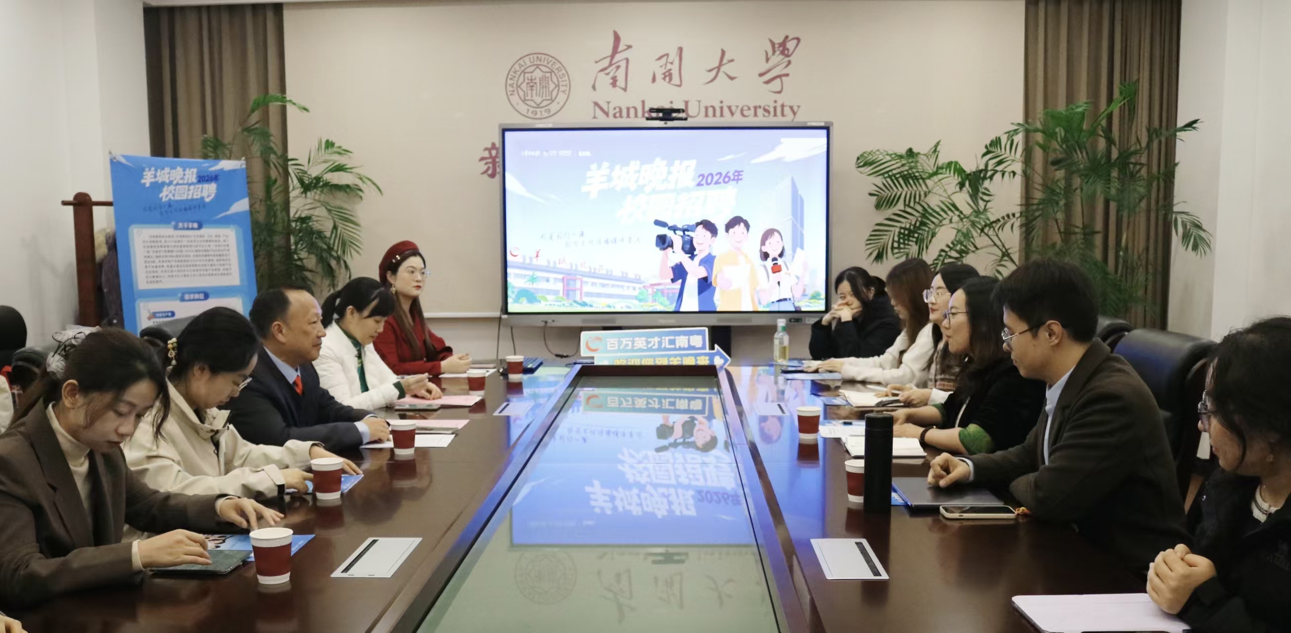 11月28日,羊城晚报报业集团(羊城晚报社)(以下简称“羊城晚报”)党委委员、副社长赖家彦,人力资源部主任彭敏晖一行来访,开展校园招聘宣讲。信息与传播学院党委副书记李慧、辅导员吕文琦、学校就业指导中心教师刘越与来宾会谈,双方围绕媒体融合发展趋势、全媒体人才协同培养、校企合作模式创新等进行了深入交流。