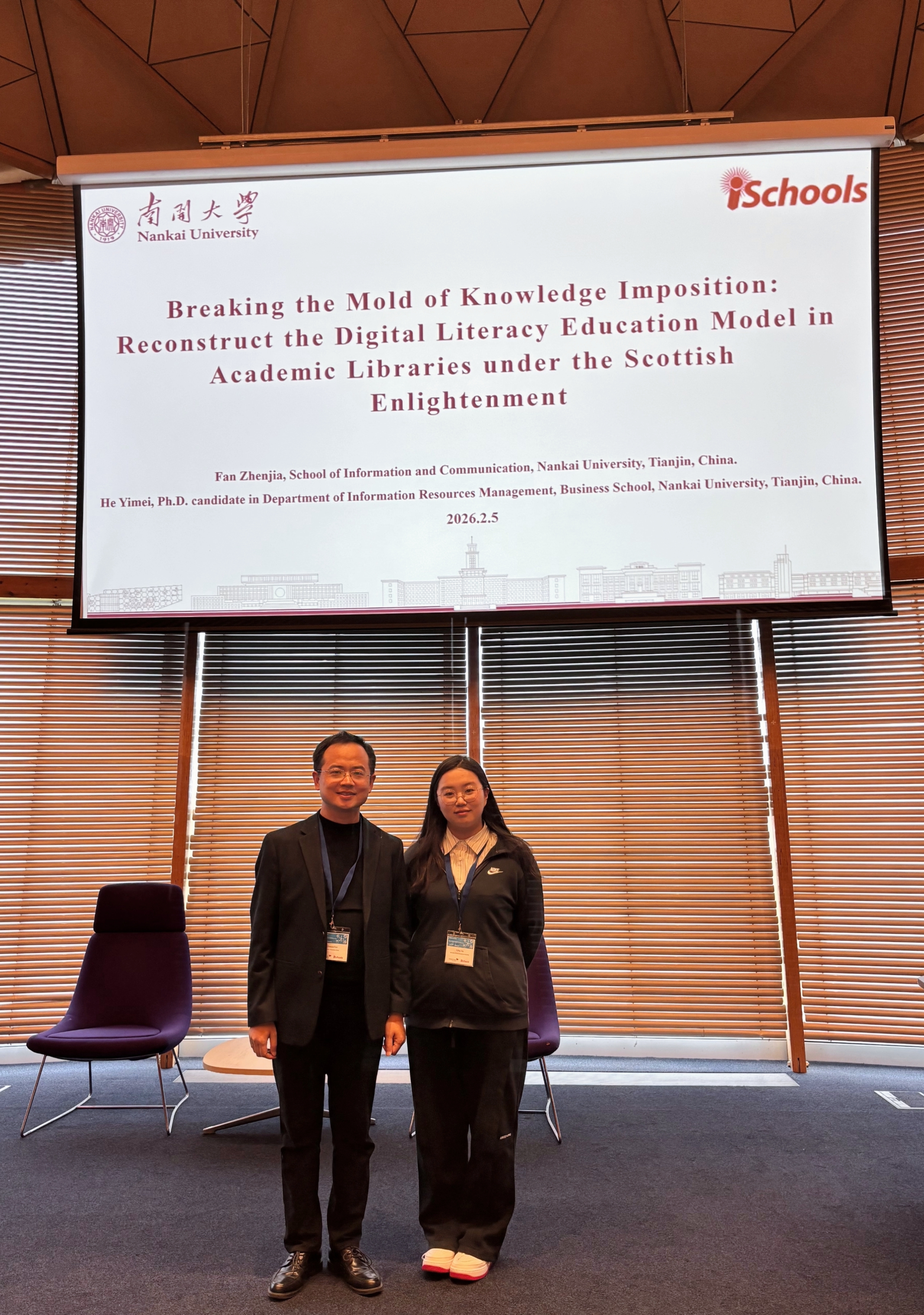 2026年3月23日至4月2日,第21届iConference以线上线下相结合的方式举行。本届会议主题为“信息素养、真实性与使用:迈向数字启蒙社会”(Information Literacies, Authenticity and Use: The Move towards a Digitally Enlightened Society)。南开大学信息与传播学院副院长、教授、博士生导师樊振佳,商学院信息资源管理系2025级博士研究生何怡美应邀参会。